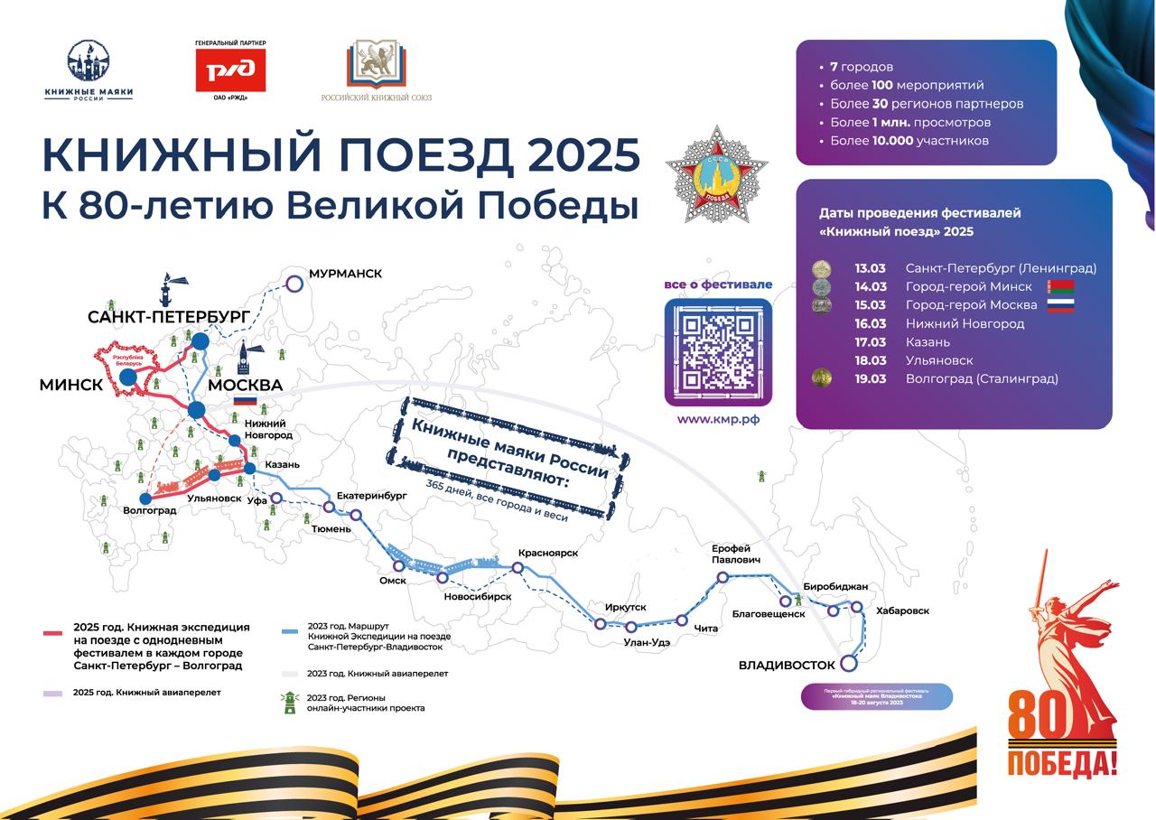Уникальный общественно-отраслевой проект «Книжный Поезд 2025» стартует 13 марта 2025 года с Витебского вокзала Санкт-Петербурга в Минск, Москву, Нижний Новгород, Казань, Ульяновск и Волгоград.